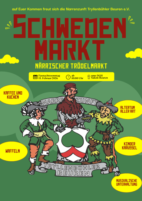 Am Sonntag, den 15. Februar 2026 findet wieder der weit über die Grenzen von Beuren bekannte Schwedenmarkt statt. Hier findet man alles von Antiquitäten, Trödel, Kuriositäten, diverse Waren für den täglichen Bedarf und kulinarische Köstlichkeiten. Für Unterhaltung und Kurzweil ist also reichlich gesorgt.
